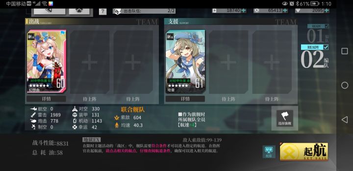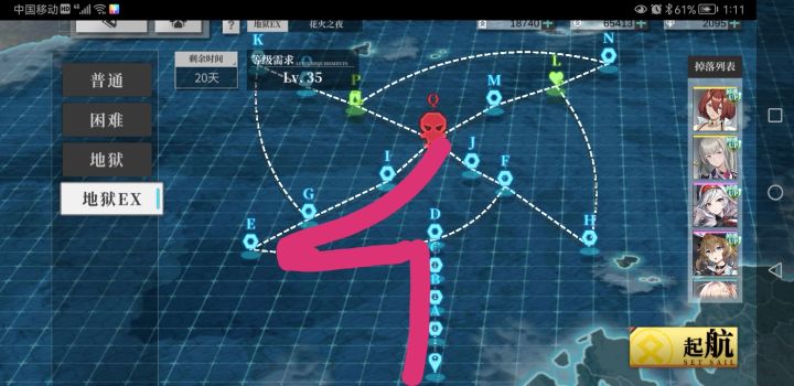 这次活动难度非常低,一二队直接可以单驱逐带奶,路线如一图红线所示,我选择这条路线主要是能少打一回合,支援需要带上海伦,开路条件是舰灵数量小于10,队伍总索敌大于550,一队可以带拉菲,自带回复,我支援带的海伦,二队随便一个驱逐高练度支援加个奶即可,总体下来油耗不到500。祝大家活动天天出货