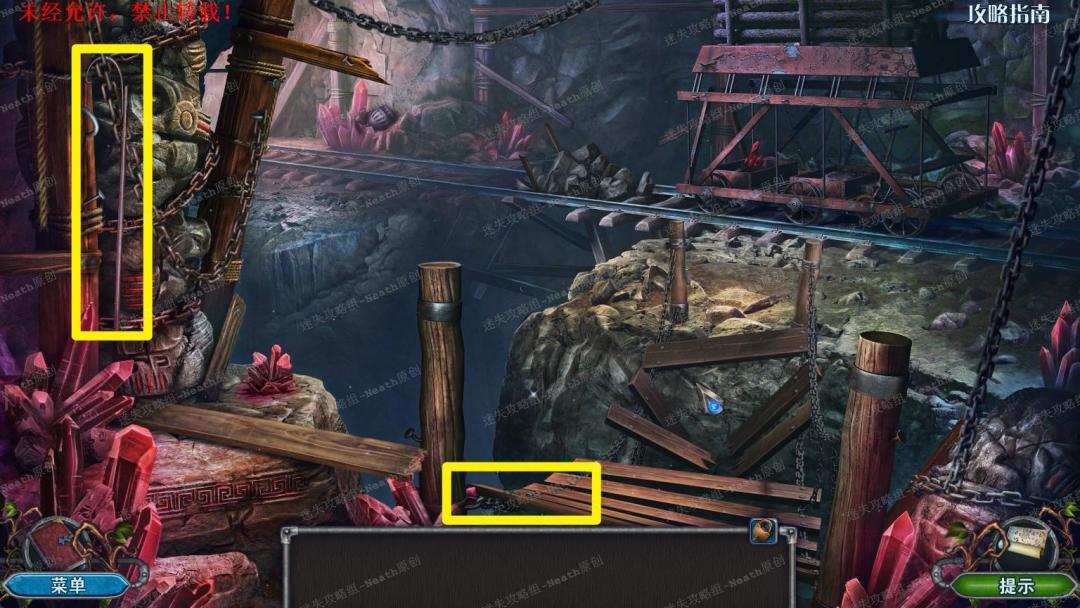 191、在矿车尾部捡起【鹤嘴锄】,使用【鹤嘴锄】清除矿车前方障碍,把【钩子】插入矿车操纵杆并拉下。191 191.1