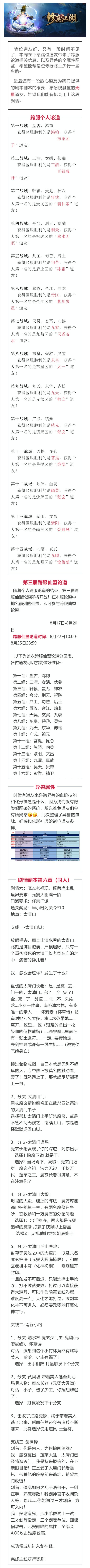 跨服个人论道结束,跨服仙盟论道即将开启。异兽全属性曝光,热心道友的同人剧情。