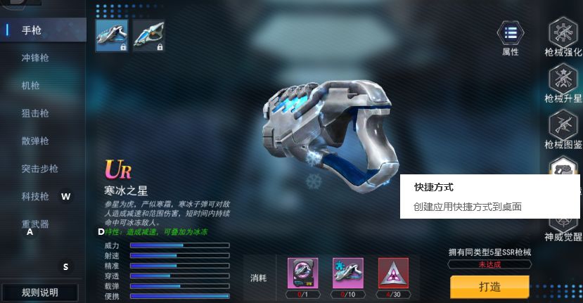 1、在枪械图鉴之下新增神兵打造,此界面用于制造UR枪械。