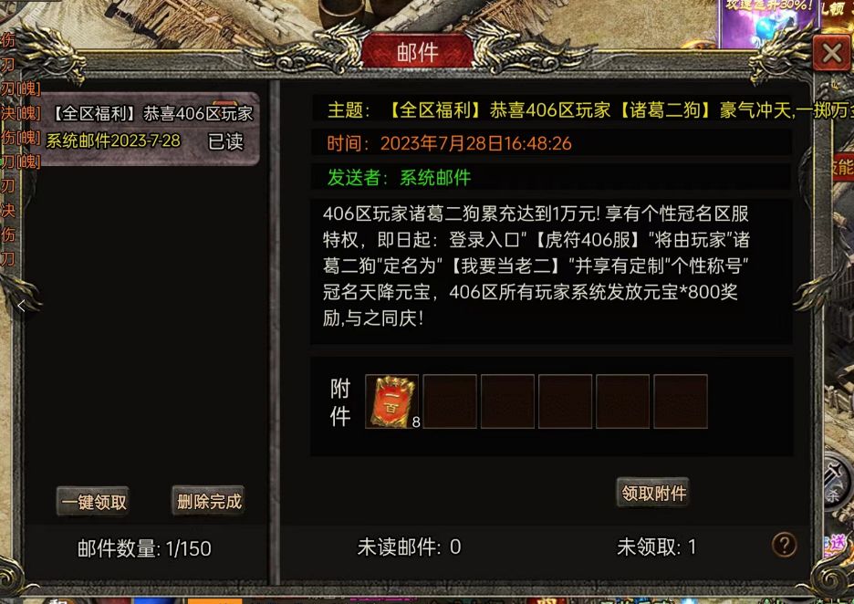 【全区福利】恭喜406区玩家"【诸葛二狗】"豪气冲天,一掷万金" 成功冠名!!! 406区玩家诸葛二狗累充达到1万元! 享有个性冠名区服特权,即日起:登录入口"【虎符406服】"将由玩家"诸葛二狗"定名为"【诸葛二狗】"并享有定制"个性称号" 冠名天降元宝,406区所有玩家系统发放元宝*800奖励,与之同庆!