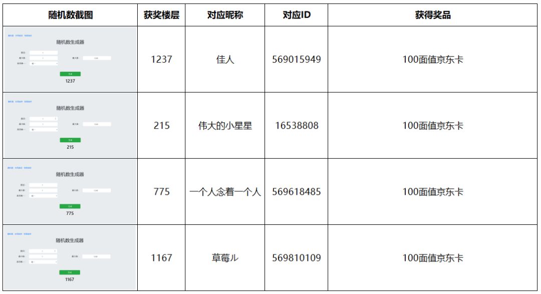 活动截至时有效楼层为1246楼,经随机数抽取获取获奖楼层和名单如下: