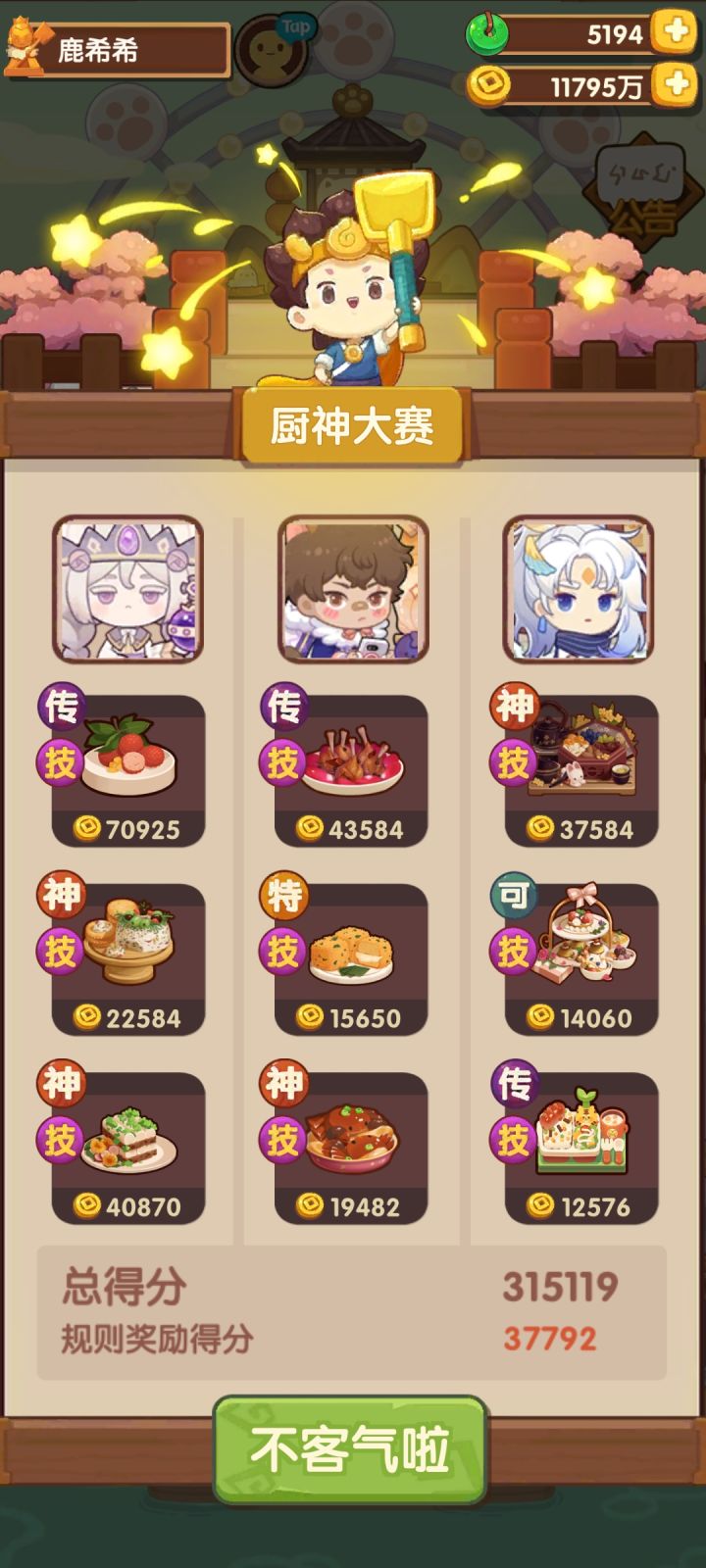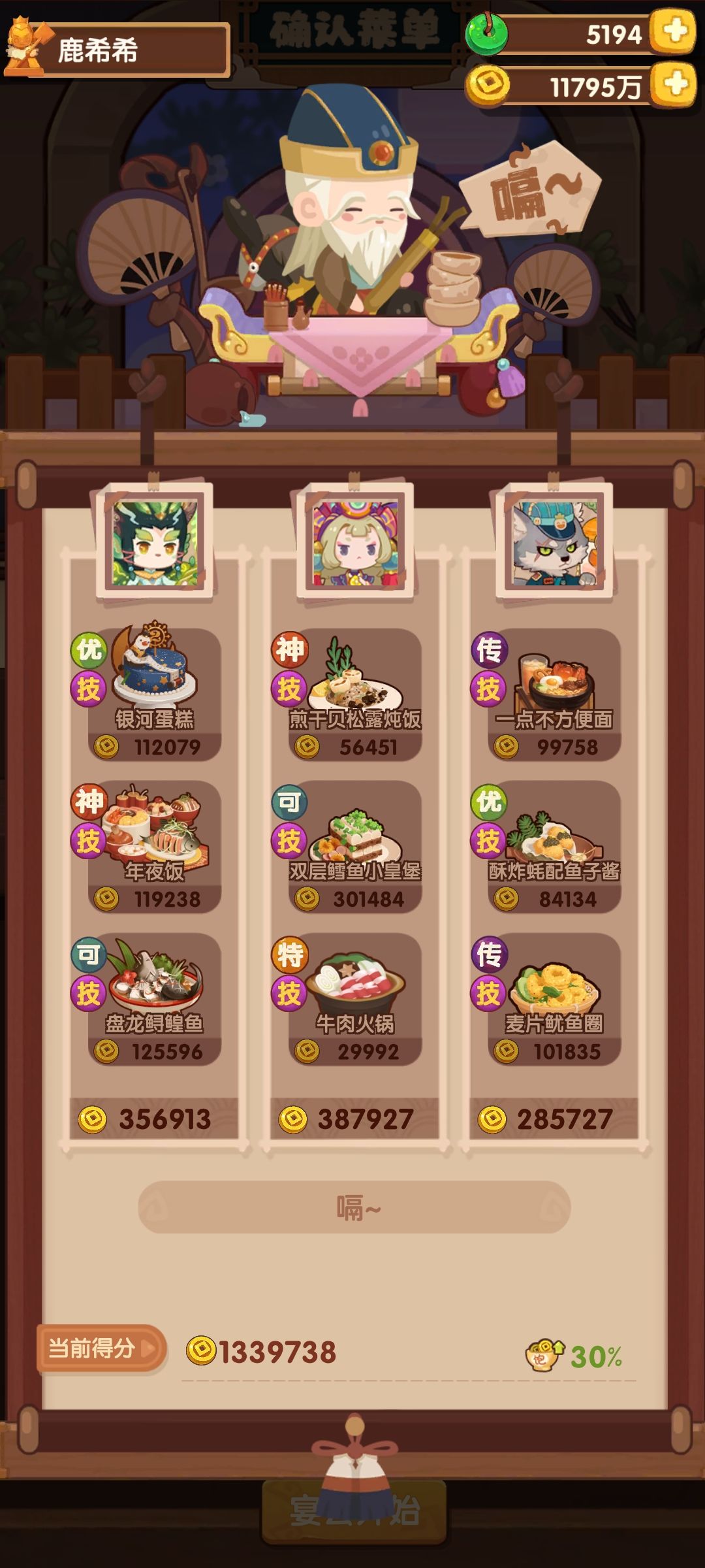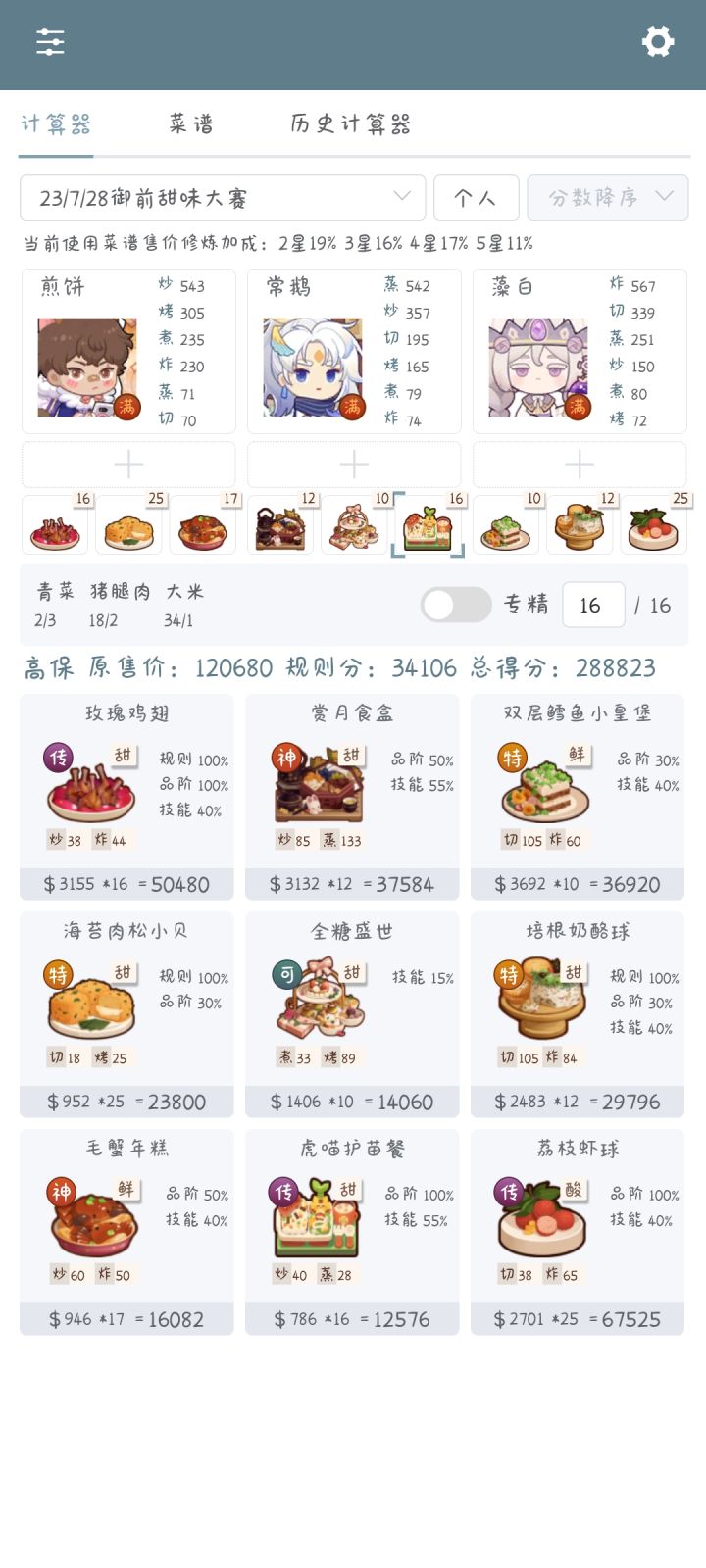 这一次的厨神有点难😮九菜全上才高保的,考虑到藻白的修炼技能把她安在第一个了,果然高了点。风云宴是没加厨具版本的