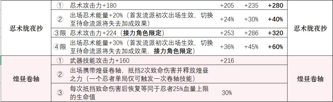 ①深渊中第二角色配备。深渊高层一些BOSS血量厚、弹幕不可消,能提供的能量很少,一些情况下带3勾忍宗+小抄都可能开不出大,而3勾忍术胧夜抄接力保证有大,还可以省下小抄的格子,带其他保命或加攻的宝物;对于第三角色因为“再接再厉”的效果,不必强求3勾,但也是比忍宗要好;