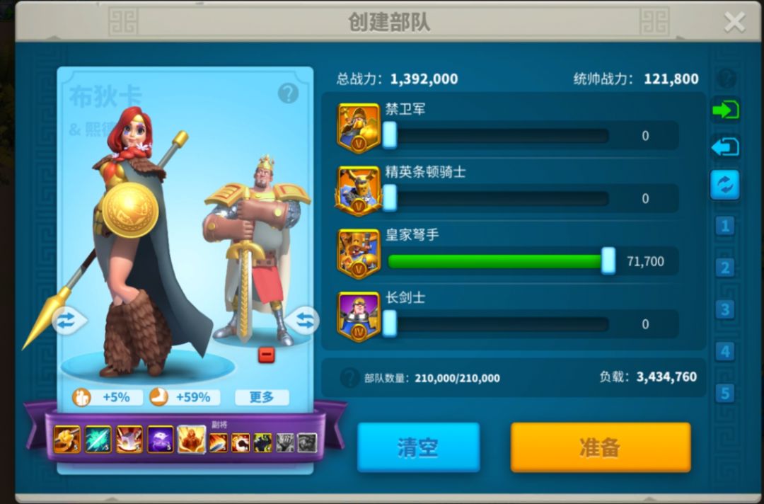 远征女王推荐配合孙武带混兵(主要是步兵,少量骑兵弓兵),双方技能相辅相成,即能不停放buff,也有不俗的输出,是很多平民非常喜欢的组合。