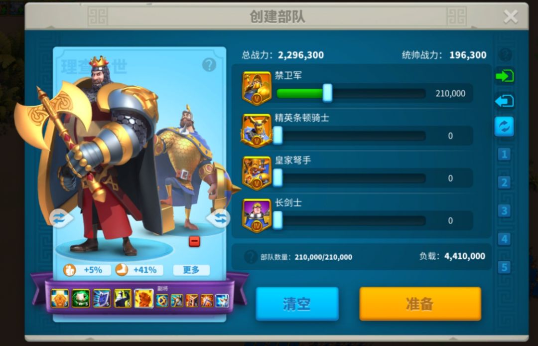 集结攻城关卡第一支队伍设置成集结队,其余四支队伍不变,集结队伍兵力大致与玩家单队兵力,城堡数量有关,最高可达到单队兵力的六倍,如图,21万一支,设置成集结队就有126万