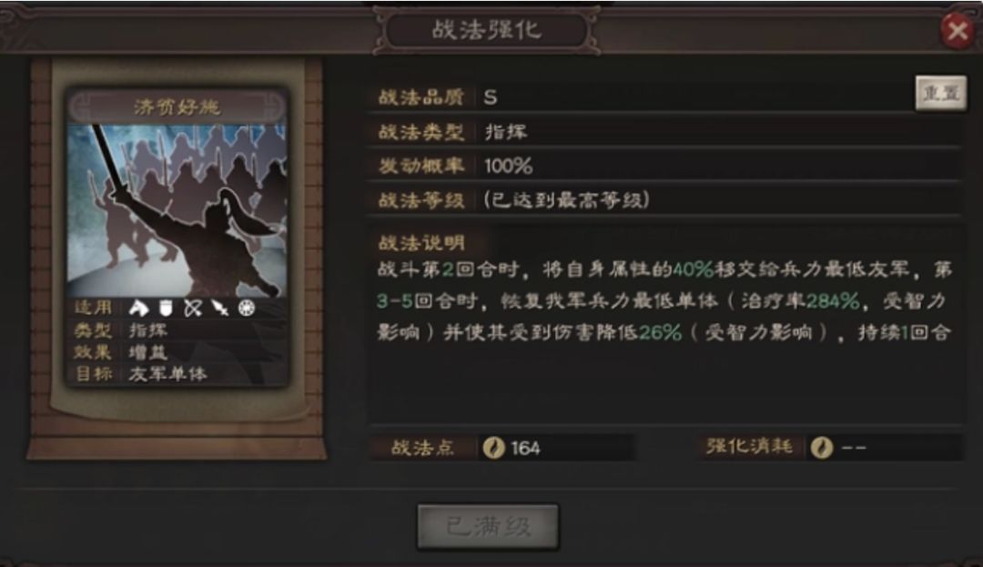 而太史慈这边我们选择携带折冲御悔和暴戾无仁,这两项战法都是伤害加成很高的战法,很适合太史慈,因为太史慈自身的战法神射可以帮助自己获得连击,并造成对手的统帅降低,然后再搭配上突击战法折冲御悔,再次降低对手高额的统帅和智力2个回合,并且自己不是主将还能令我军主将获得2次抵御,在不仅高伤的同时还能给予对手增益,是个十分强势的战法,而最后的启动技能暴戾无仁,更是可以在使用突击的时候让敌人进入混乱,并且再次额外造成兵刃伤害,将伤害拉到极致,十分可怕!