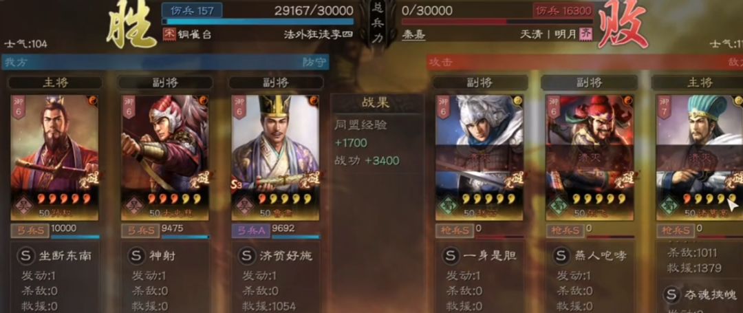 因为我们持有鲁肃的超级辅佐,在战场上其实也是不好阵亡的,尤其是太史慈高额的输出肯定是令对手头疼的,而孙权一定的输出和骚扰也会令对手难受,而这场对面有赵云和张飞,两名五虎上将,却硬生生被我们这个阵容玩死,连我们这一个武将都拿不下,令对手玩的极其难受,而我们这种配置上场,一般打个3-4队都是不成问题的,十分强悍!