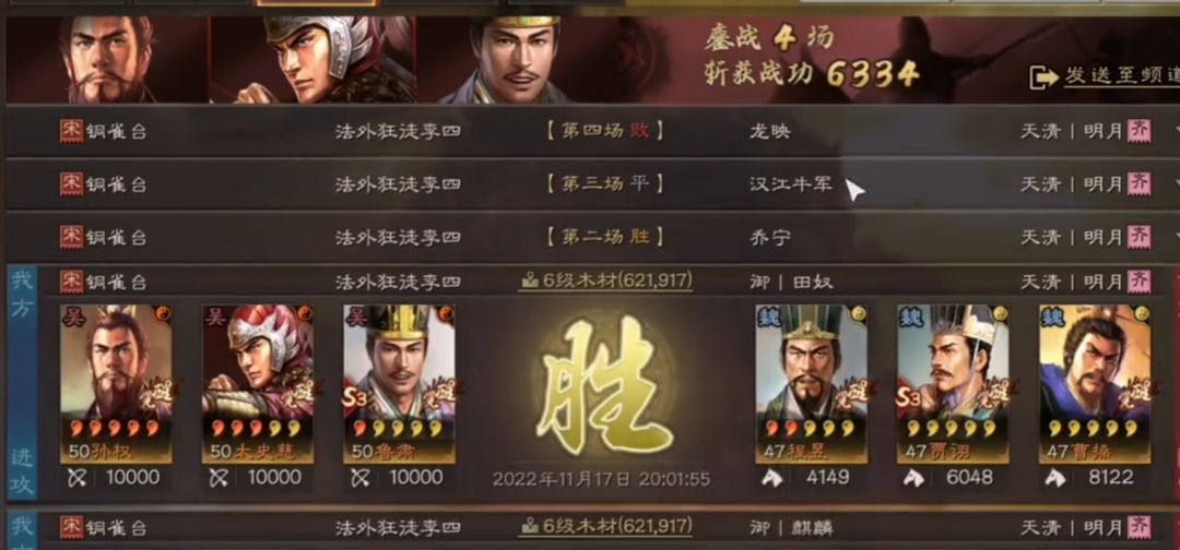 我们这边是连战了四场才倒下,而战功也拿到了6000多,我们这边持续作战能力还是不错的,战功收割机,在S3赛季是十分不错的表现了,小伙伴们可以考虑一下这个阵容,各种加成高伤,爽到起飞!