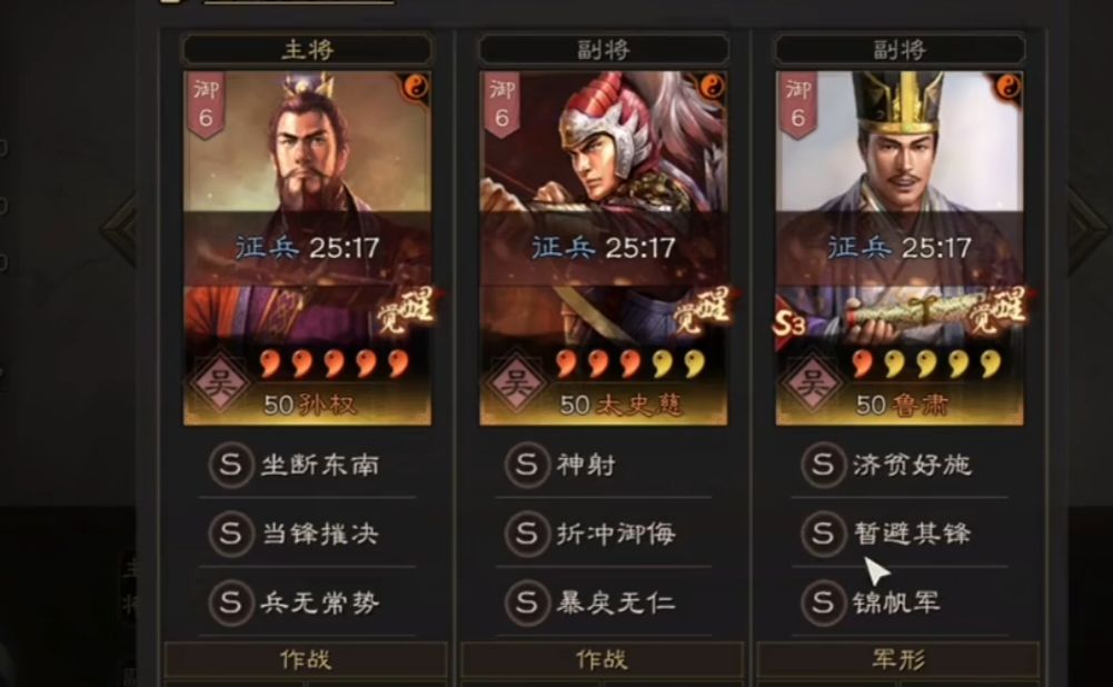 我们这边令孙权携带当锋摧决和兵无常势,我们这边之所以令孙权当任主将,是因为孙权自带的战法坐断东南可以帮助孙权在主将位置的时候,可以在自身或者友军发动攻击的时候优秀获得一项增益BUFF,提升自己,而当锋摧决可以在攻击对手后额外一次伤害,并且还能令对手1个回合无法使用战法,将对手的实力大打折扣,最后的兵无常势也是一个保全自身的战法,可以在攻击敌人三次后为自身回复血量,保证自身的续航,攻防兼备!
