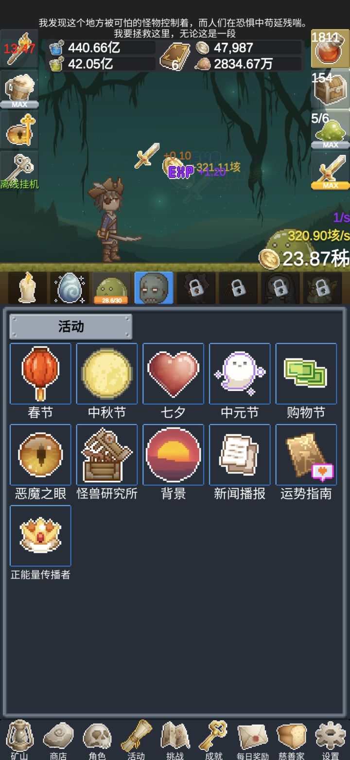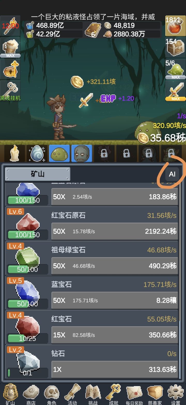 最艰难的就是没转生之前,按照官方攻略去做就好,转生几次后会非常快,有时间盯着屏幕的话,有两点提醒:第一,矿山里的升级可以点出这个AI,游戏系统会根据当前金额给出最好分配,第二,就是播报里的最大收益,把狂欢时刻,恶魔之眼,和第六波的宝箱怪放在一起点击,先点狂欢时刻,然后依次,收益很可观。最后感觉慢了,可以尽快转生,四到五次,几分钟就可以超过没转生前的最大的收益。