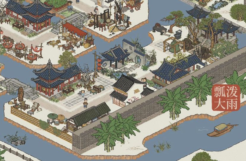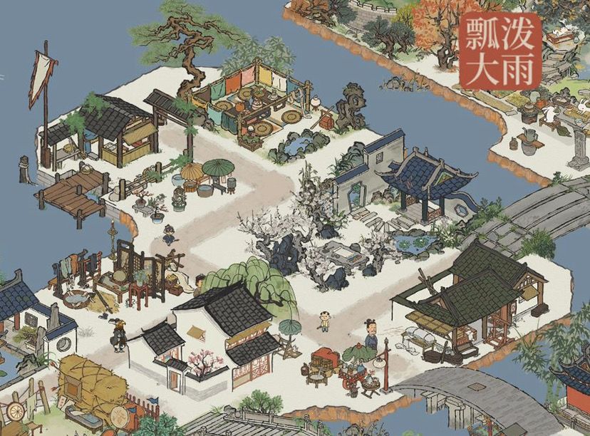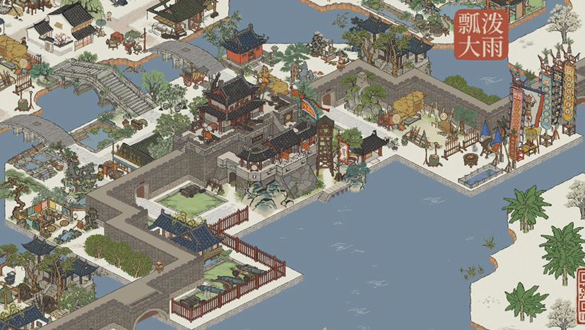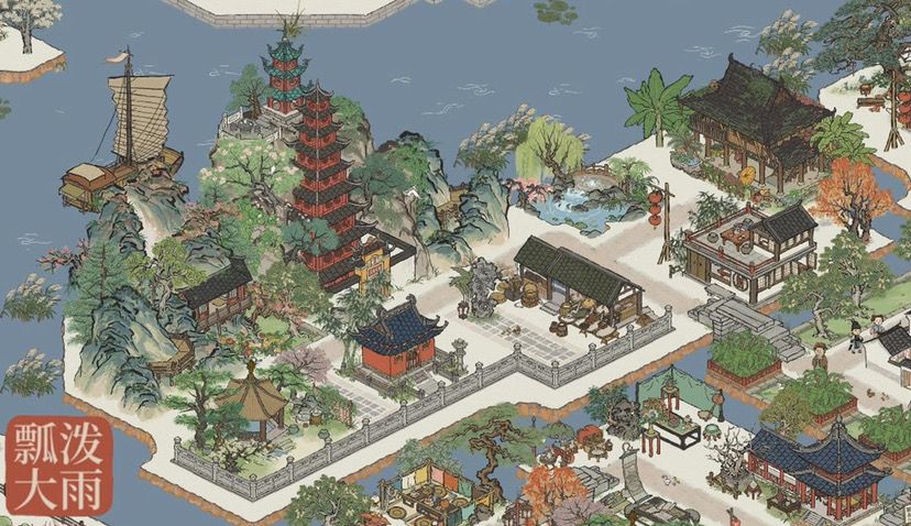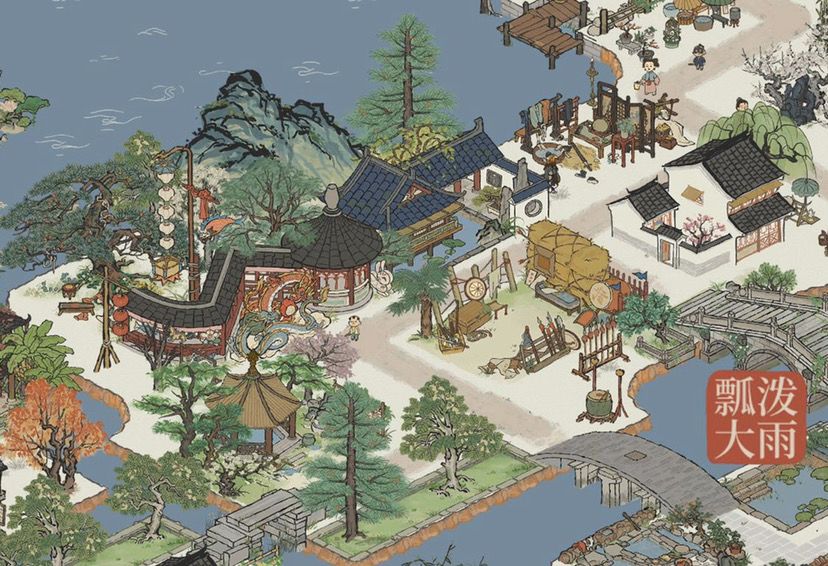 【柳絮泾】&【飞雪泾】本处因板块周正且范围大,摆放宫殿庭阁,辅以高山翠岭,营造宏大威严的景观。