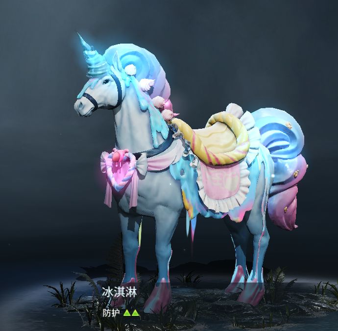 全新坐骑——冰淇淋看起来是不是有点想传说中的梦幻独角兽?冰淇淋一般的兽角、鬓毛、尾巴,让人了忍不住咬上一口。再配以充满少女风情的马鞍和配饰,猛男看了都心动!当然,你别看冰淇淋软趴趴的样子,但它有着较高的防护能力哦~