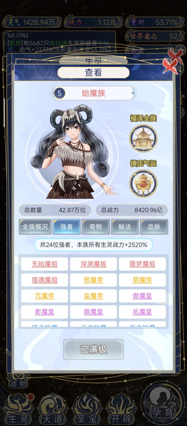 所有强者都刷完了,每个种族上限24位,奇物55个,18秘法,18血脉,天道最高大千世界,炼化世界最高+120%战力,种族除了超脱5个外其他都是6个种族。