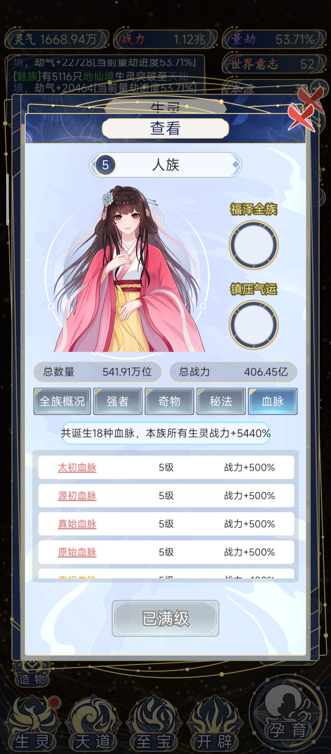早期中期主要扶持一个种族,不要诞生新人口,所有资源给一个(我给的人族),刷到大世界后全力发展种族和人口,重新分配至宝和资源,到大千世界,诞生超脱族后所有资源给超脱,包括升种族,至宝,强者,秘法,血脉,道韵和最强种族,迅速打到1000亿战力种族。