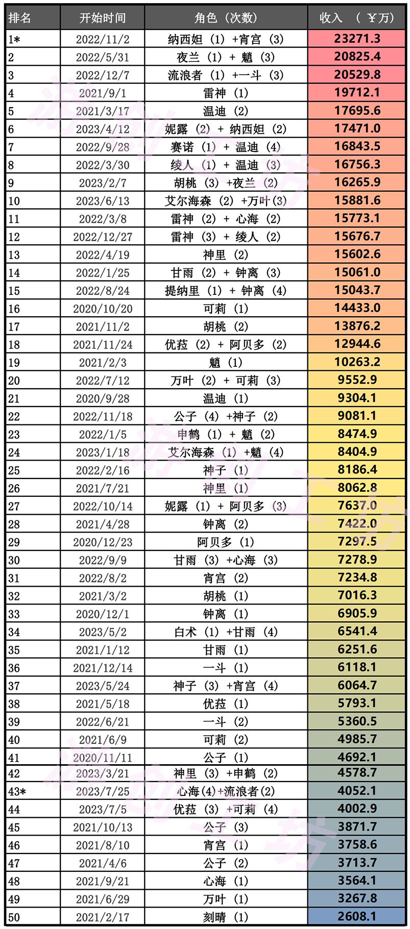 【原神开服至今全卡池前两日收入排行榜】