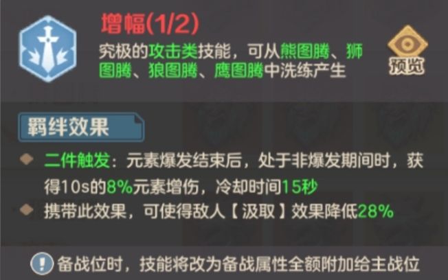 增幅:主动触发,伤害增幅效果可观,虽说在非元素爆发期间触发,但是在运用上综合性还不错,无论在pvp还是pve中都能获得收益。运用在主战图腾上谈不上有多出色,但是综合收益还可以,中庸之道。备战属性平庸,没有突出的属性,备战不推荐。