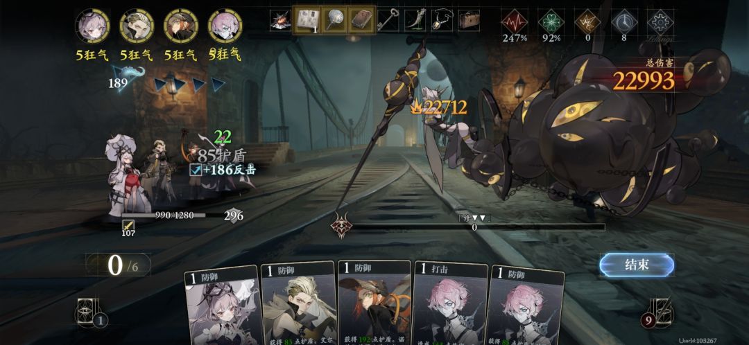 基础打法:叠盾保证生存的同时适当输出,等待凯刻斯灵知觉醒后猛叠反击,同时注意boss攻击意图,在多段攻击时开启潘狄娅大招叠加反击