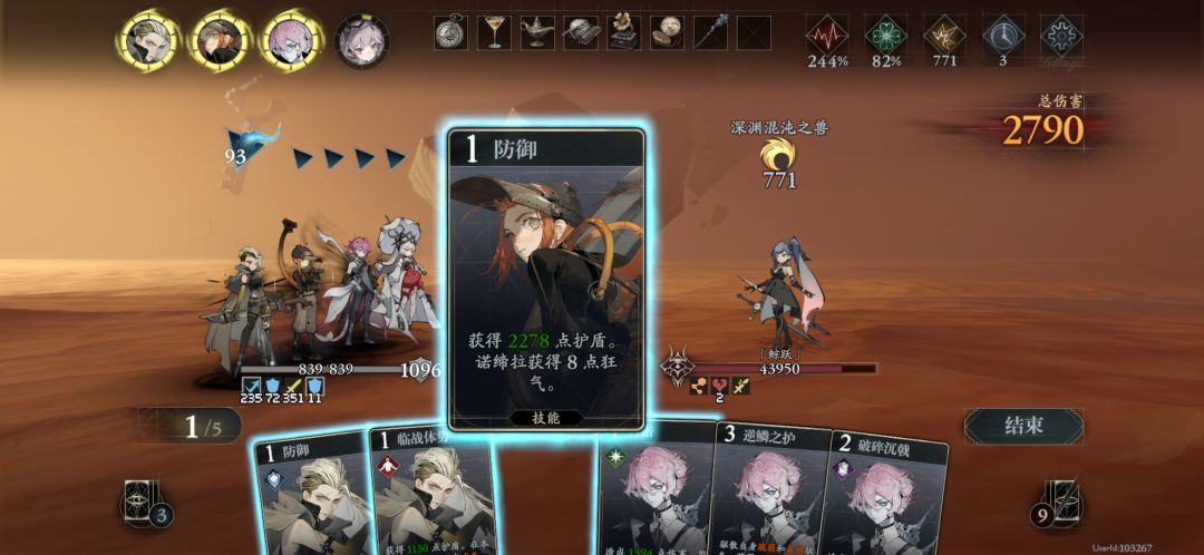 奥吉尔大招提供护盾与临时力量,配合潘狄娅的大招能够在一回合叠出大量临时反击,配合凯刻斯的逆鳞之护(反击触发两次)应对boss多段攻击效果强力