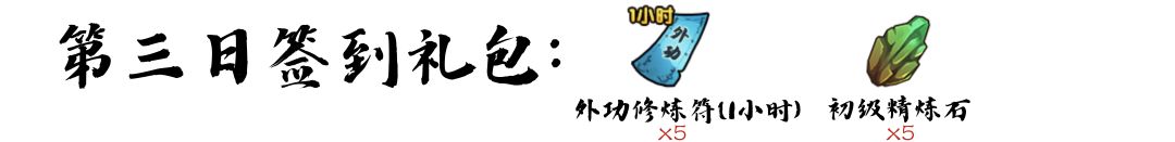 1、累计3天签到:元宝*300、溶洞石髓*10、中级阅历书*5