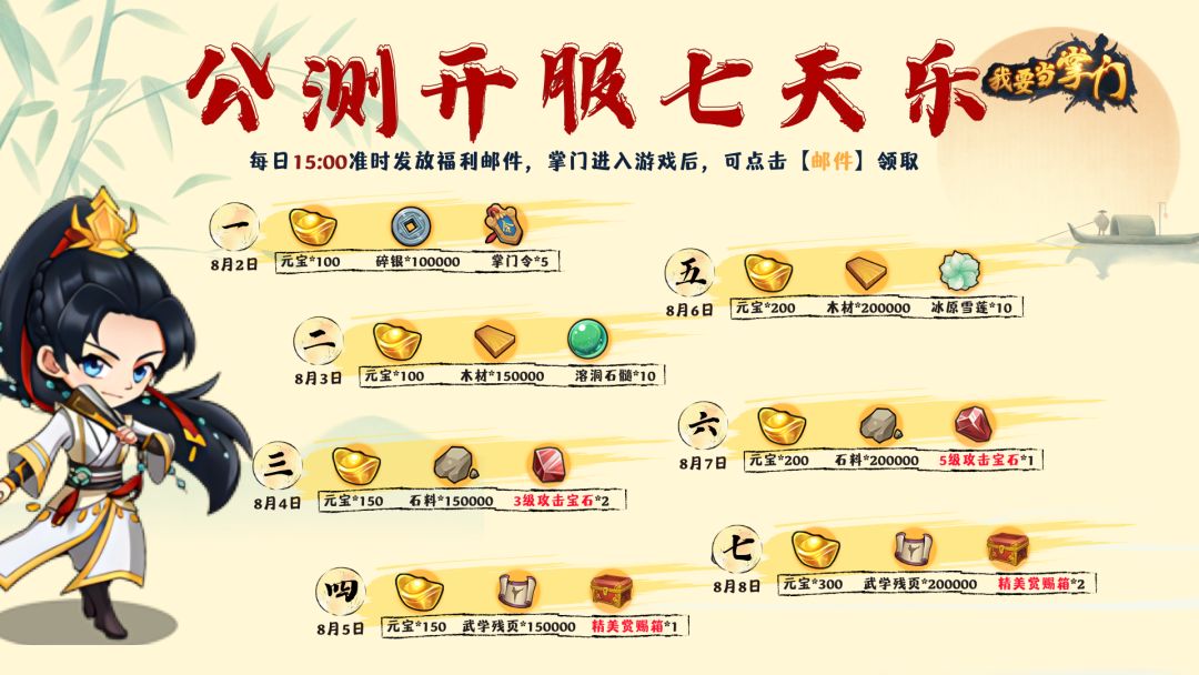 2、掌门可在每日15:00后进入游戏邮箱查收福利邮件。