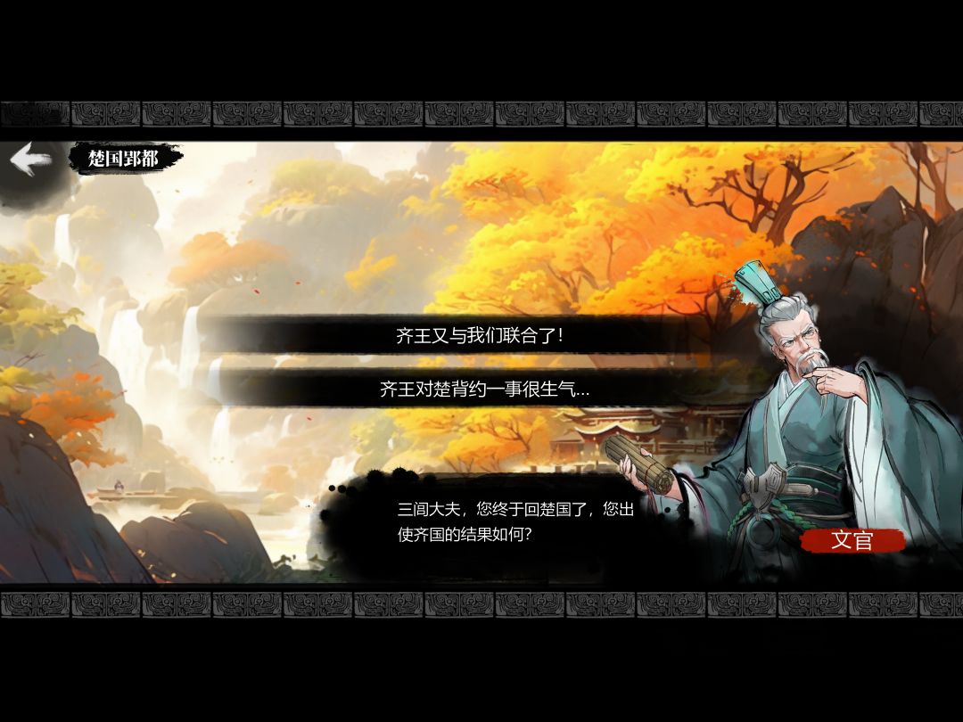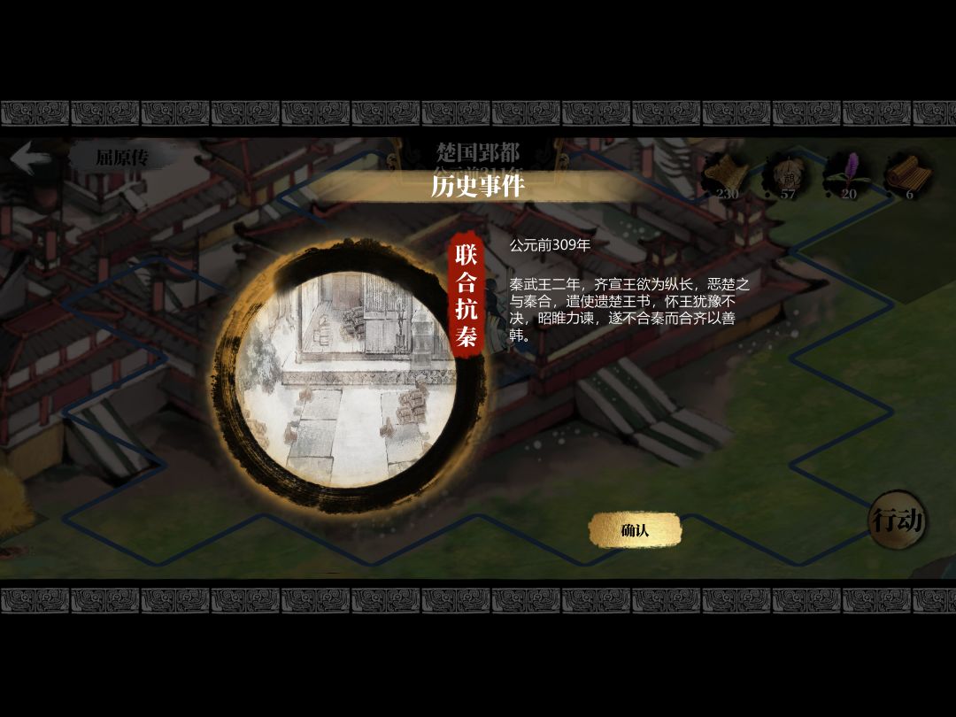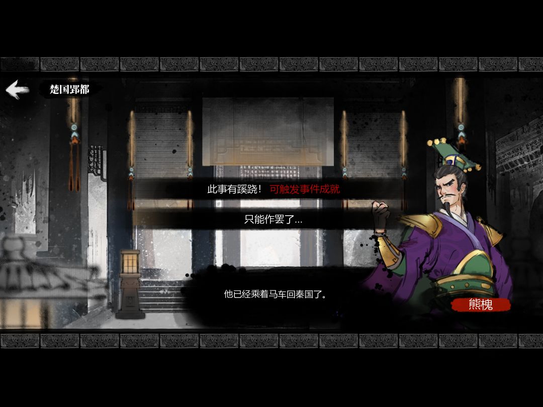 与“熊槐”对话,选择“此事有蹊跷!”,触发历史事件“劝谏楚王”,触发历史事件“联合抗秦”;