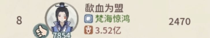 跨服第八:歃血为盟,10-19强者,原名歃血盟,全服实力最强的人之一,游戏理解深厚,本届跨服第一的有力竞争者,最终以失败告终,实属令人惋惜,有朝一日虎归,定要血染半边天!