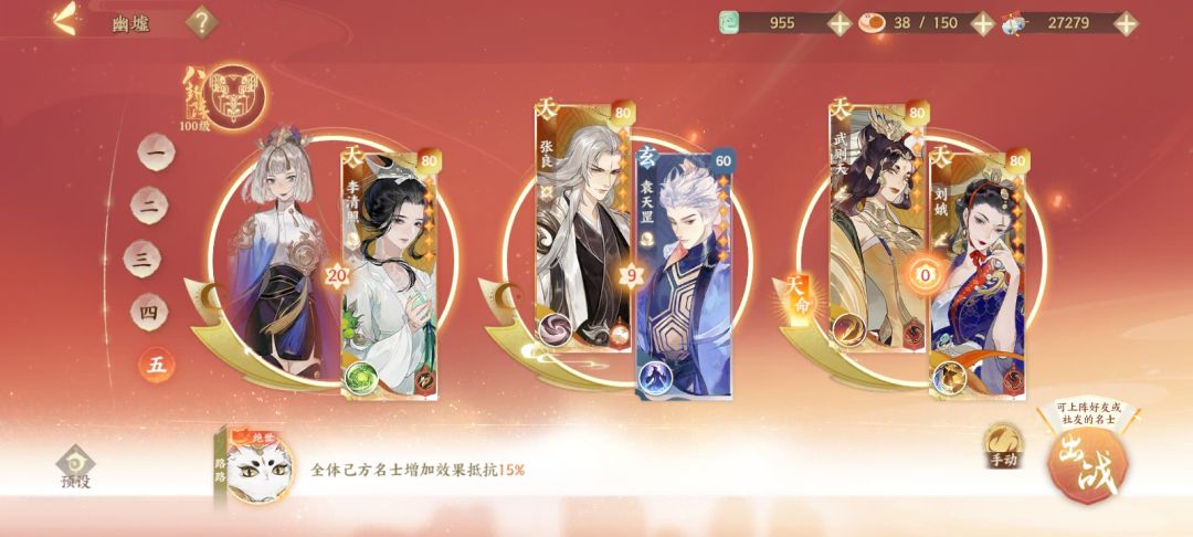 嬴政群攻,只带了三个名士,李清照是要双清影的加攻,多两个名士也可以一回合结束,图上的花了两个回合