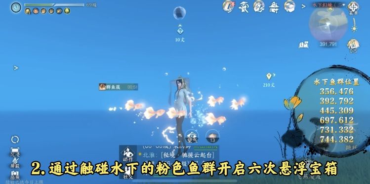 触碰后鱼群会带你升空,空中的宝箱被你碰到后会掉下来,开启六次悬浮宝箱后,就能在成就的万象-探索中获得趣味技能:群鱼簇