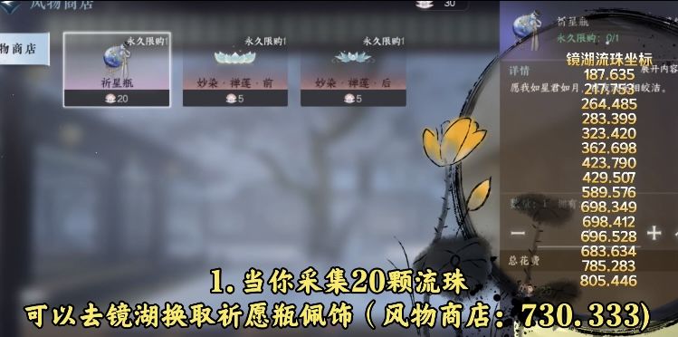 镜湖流珠30个(水下幻镜坐标与水上的相同,都可以按以下坐标分别找到15个流珠)