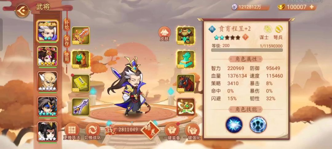 时隔一天,魏国六坛已刷完,配置跟前面基本大同小异。因为单邓艾加速不保险,所以用程昱换下了月英,另外有些关卡米妹打得明显太刮痧,选择了上于吉加强童渊输出,问题不大。胸弟萌,放手去刷,那都不算事儿。