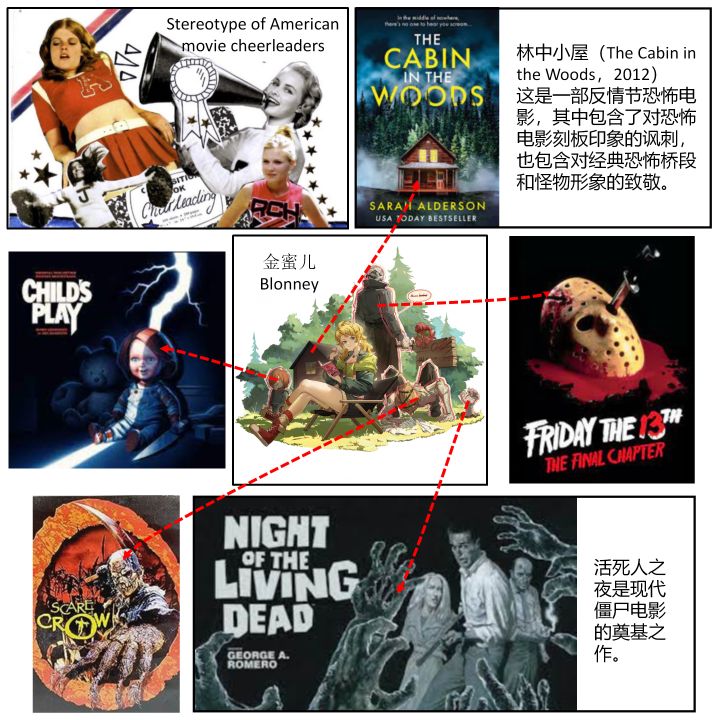 在基础形象上,金蜜儿就继承了这种Virgin无辜者形象,在她的精二立绘里,露营躺椅上的金蜜儿被各种经典怪物环伺,其中出现了包括活死人之夜(Night of the Living Dead,1968)、稻草人杀手 (Scarecrow ,2002)、十三号星期五(Friday the 13th,1980)、鬼娃回魂(Child's Play,1988)等。