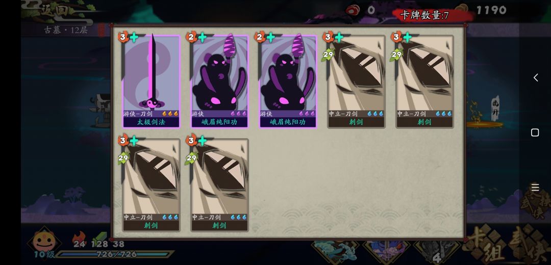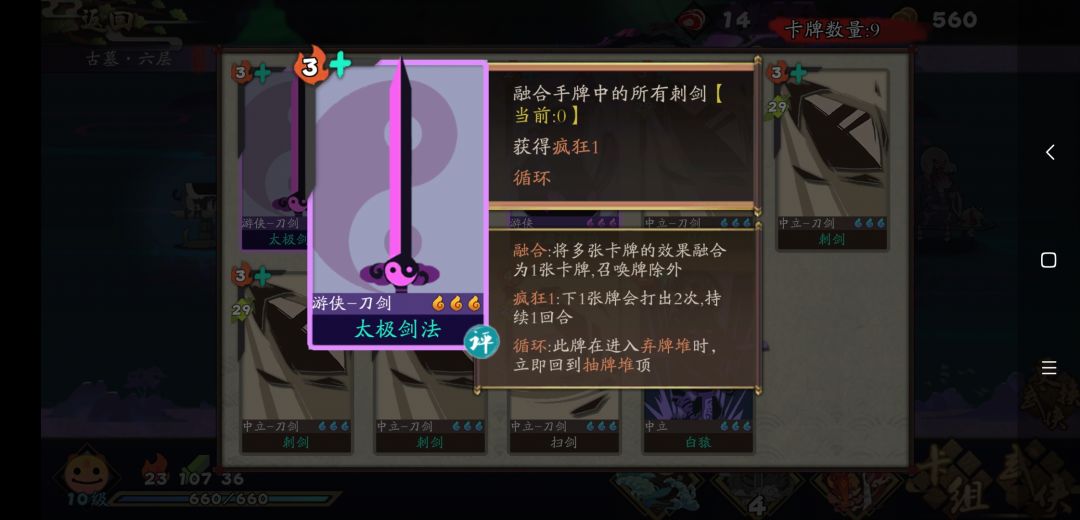 第2剑开始,有几张刺剑,太极剑就给几个疯狂,意思就是从第2剑开始都是5倍伤害的太极剑,只要狂烈给到了太极剑附魔,初始卡组,3剑必杀2人组,4剑必杀3人组,就已经是通关卡组了,真的强狂烈这磁条