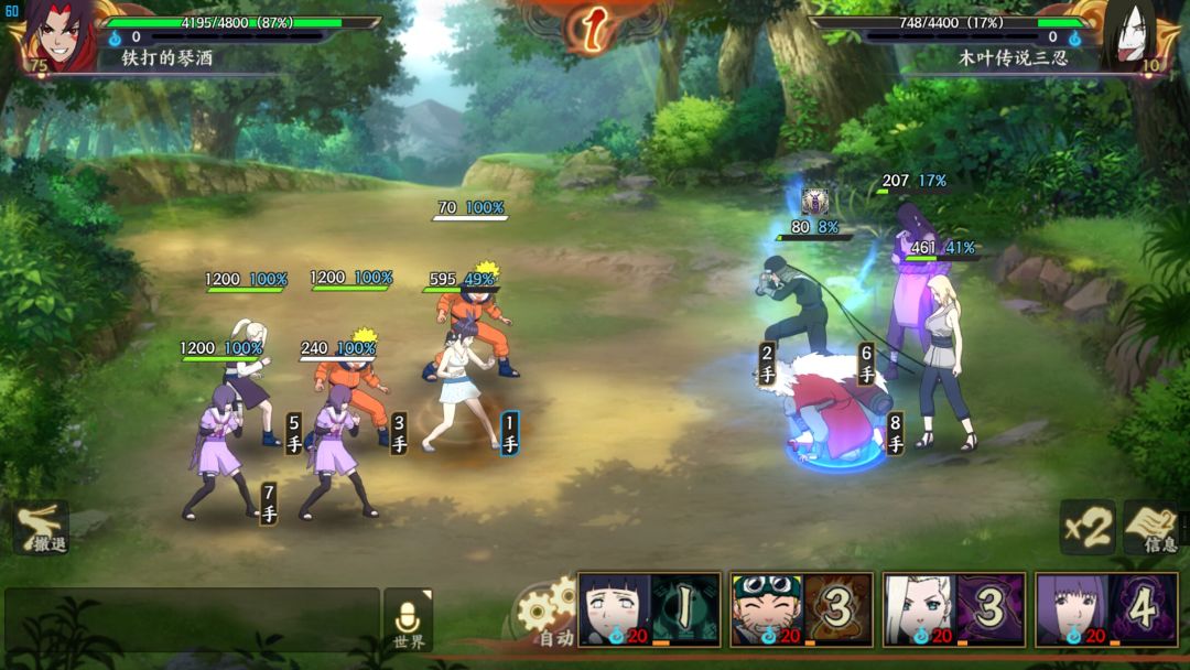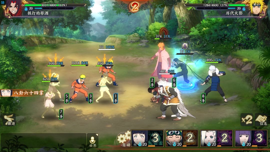 开局鸣人被动打掉二代四代闪避,然后小班长混乱二代(伤害高)井野混乱四代(伤害比较低,主要防止触发追打),然后随便打就是了,三代依旧不用管