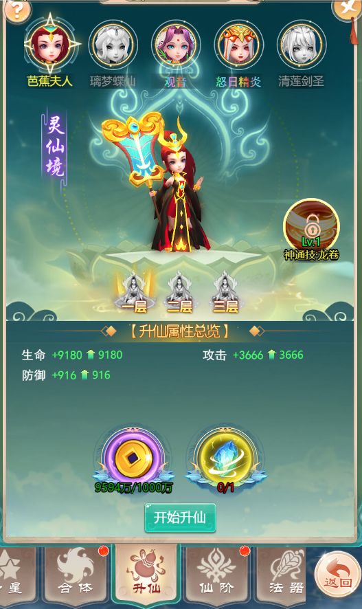 首先,【升仙】这个是一个超后期的玩法功能,基本属性还是加生命、攻击、防御这些,这个跟其他属性差不多。