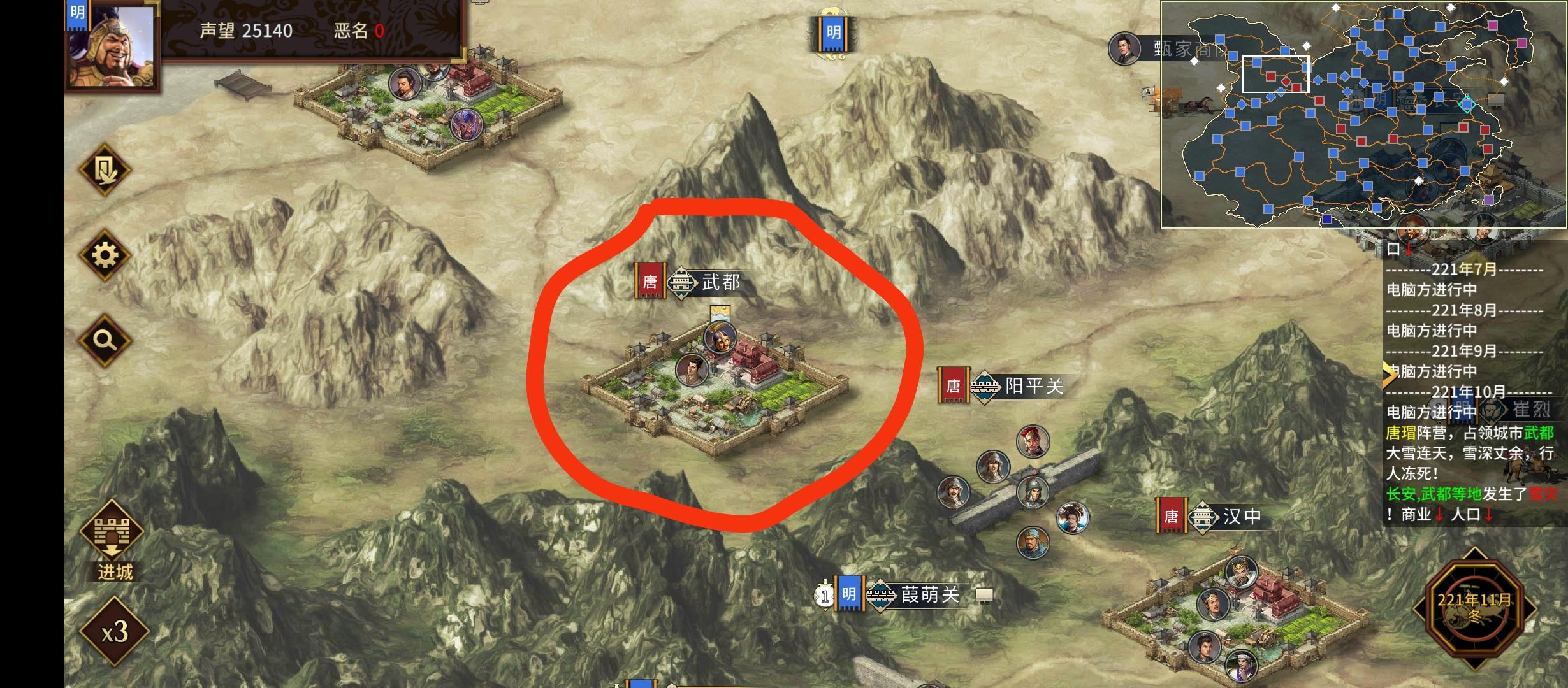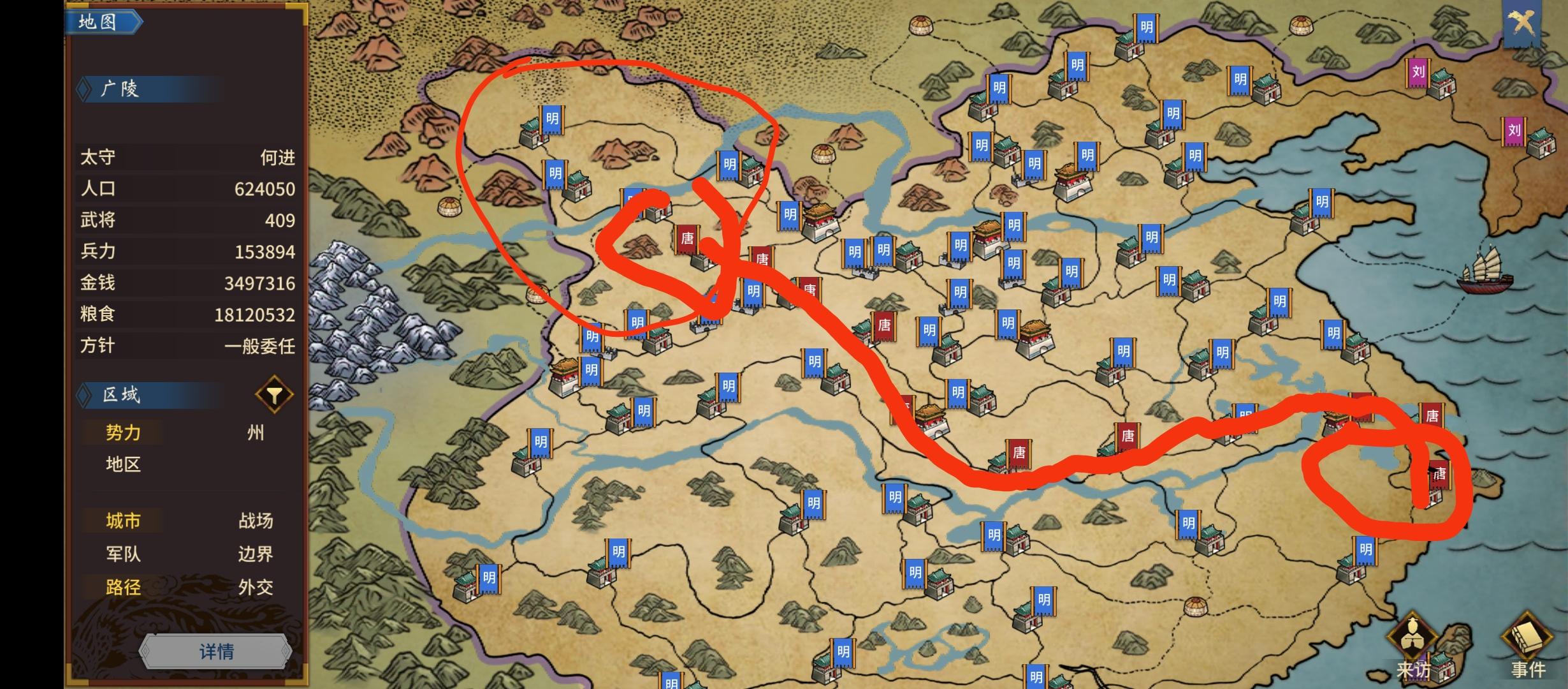 如图,把唐瑁的军队从会稽一路引入武都,然后从梓潼出兵拿下汉中,武都之外的城也顺势拿下,只给唐瑁留下武都一座城,然后我就可以关门养蛊了,守住长安和汉中两座城,把西北五城让给唐瑁,我就可以在西北慢慢的和唐瑁玩了。