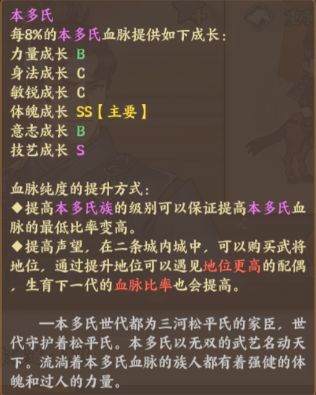 先来了解一下氏族血脉成长的侧重点。本多氏主要侧重于体魄和技艺的成长。