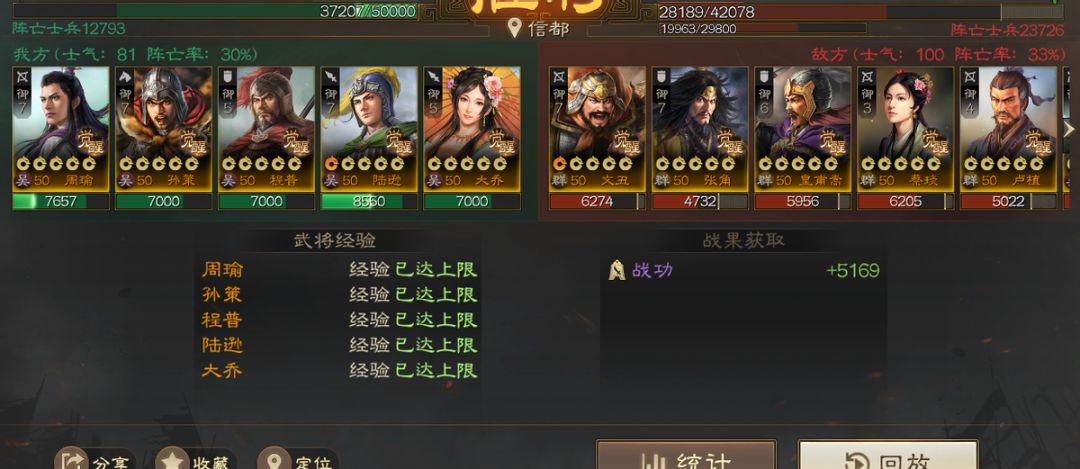 这边可以看到我们陆逊在自身战法和队友的辅助加持下,伤害和救援的兵力都是拉的很高的,而对手就算人多,但没有注意不去手动刻意改变武将的范围的话,就会被陆逊的神火计大伤,并且还能回复兵力,十分恶心,而第二输出位的周瑜表现也是不错的,在没有救援的情况也打出了接近30%的输出,这也多亏了孙策和程普在吸引火力,还有大乔给予的负面增益,综合来讲还是十分不错的一个阵容,毕竟5只武将穿了敌方8只武将,十分强悍!