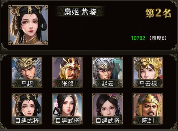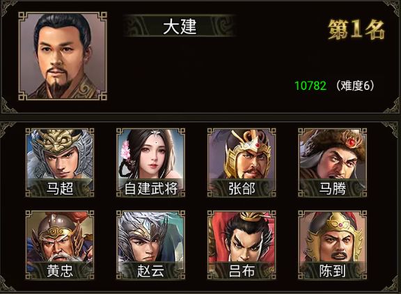 马超、张郃、马腾、黄忠、赵云、吕布、陈到、诸葛亮和两位自建武将