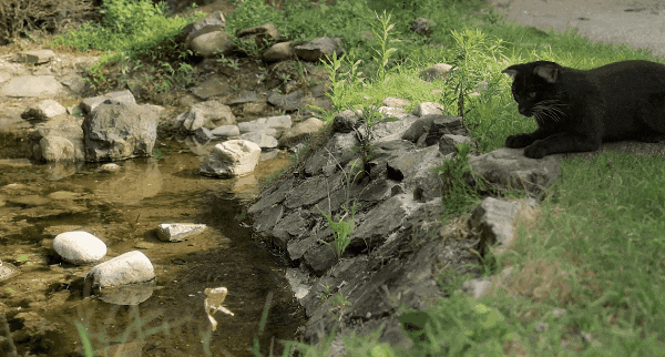 视频结尾中的黑猫不知是否就是当年的那只,看它熟悉的脚步,似乎已经守候庭院池塘里的锦鲤许久,而曾经那个想尽办法为自己制作机关猫的人,不知他日可否再相逢。