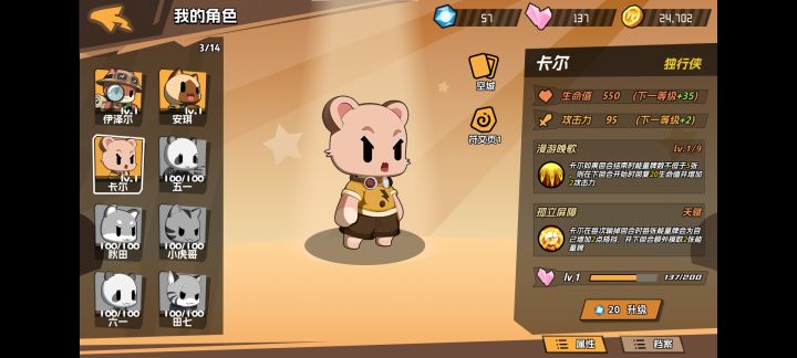 三、角色:下面两个角色的话我用的比较多。卡尔在前期败可以快速摸牌,还有回血减伤,能稳定把牌抽完,但是需要自己前期出牌的时候略微组连2对或者连3对,把A或者3张的牌稍微打一些(不要留炸!!!)