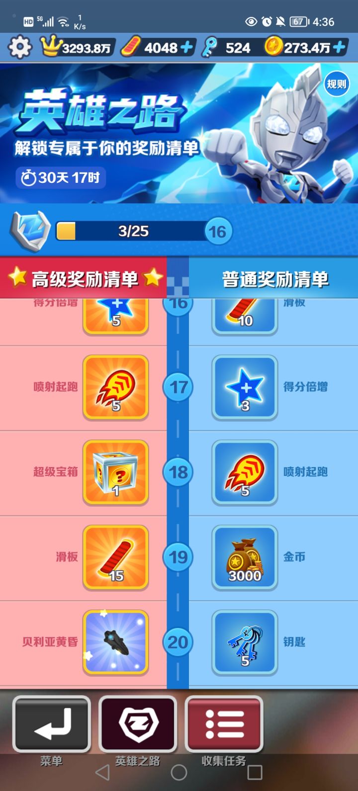 在无尽模式中,收集Z形灯💡,可以提升等级,获得金币,钥匙,宝箱等,花费10万金币可以解锁高级奖励清单,免费拿泽塔杰森奥特曼,到达20级后可以获得贝利亚黄昏背饰