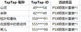 恭喜以上5位队长获得【P5X明信片套装*1】请您务必在平台填写获奖收货信息,或在3个工作日内加入官方QQ群,请联系管理员@草莓 或 @诗夙 提交社区ID、个人信息截图,以及中奖通知截图,我们会在核实获奖者身份后,为队长提供相应兑换!再次感谢大家参与本次活动!
