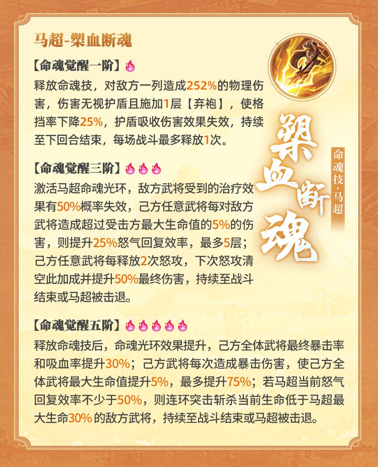 但是作为对如此强的效果的限制,需要马超拥有50%怒气回复效率,也使得马超无法在开局就获得斩杀线。