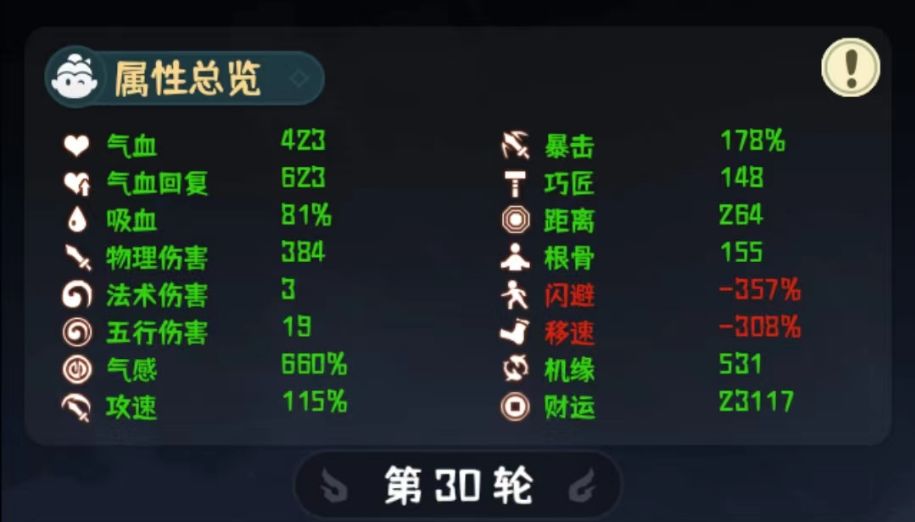 其次就是尽可能「将闪避和速度换成其他属性」,因为有道具,可以将闪避换成气感(气感就是加攻击百分比的,最高 660%),将速度换成气血回复(气血回复就是加快血量恢复的)