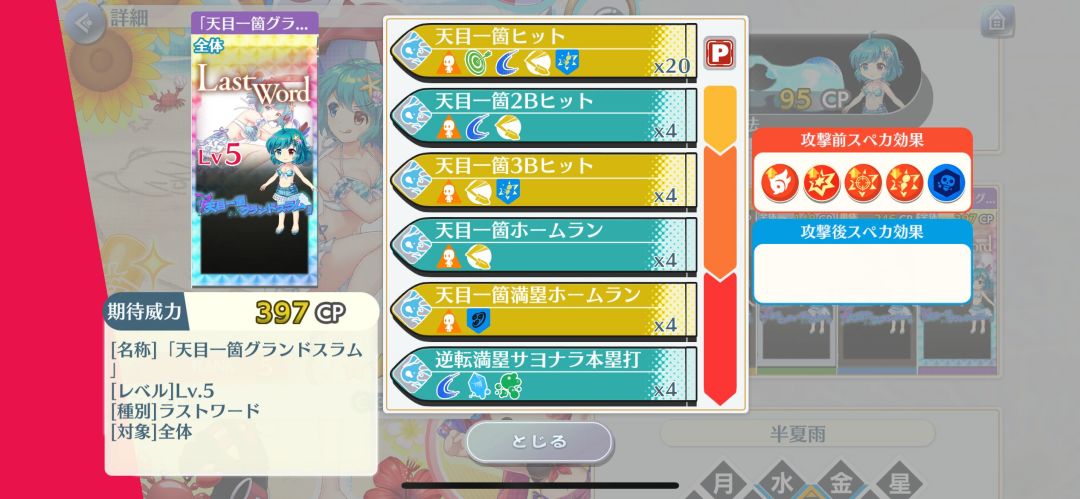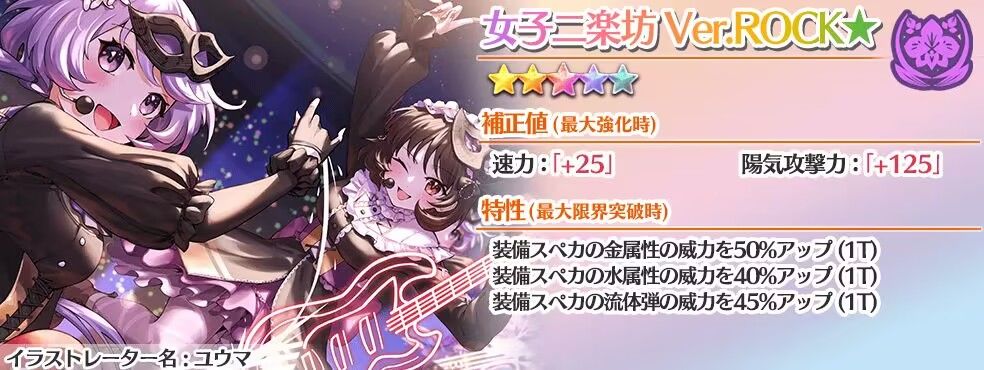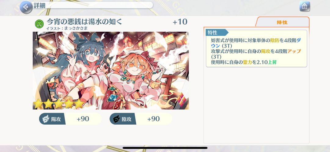 自身阳攻II1段、会心攻击命中2段,配合技能以及能力,可以做到起手满buff(除了速力,因为给到了小卡)