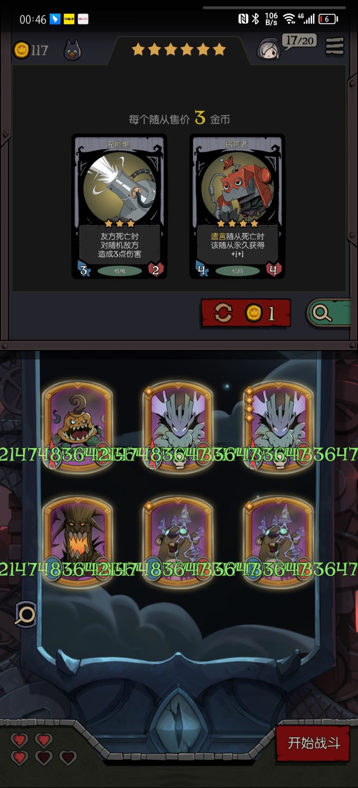 方案一:机械、野兽、自然(为了方便,就娱乐模式演示了),其实不用野兽也可以,就是刷钱慢一点。先电表倒转刷钱,然后用机械的5星牌刷自然族6星的附着(卖掉其它自然族获得两倍的属性),反复的刷卖,可以场上得到5个21亿的怪(留一个不升金星)。然后把没升级金星的怪合成金星捏在手里,再把场上刷成5个21亿的怪,把手里的扔上去。