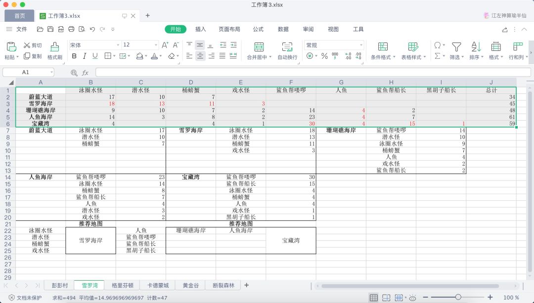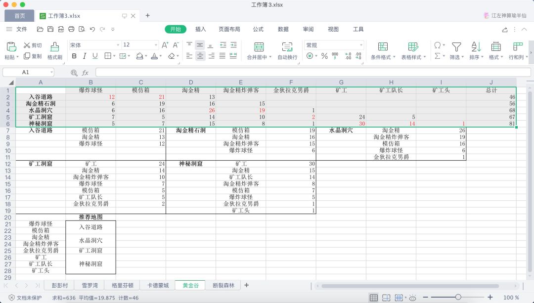 是每张图里每种怪物的分布数量,红字标识是五张图中相同怪物出现最多数量的地图,旨在引导新人少走弯路(刷材料升装备)和为老玩家日常刷钻、工会任务偷懒。