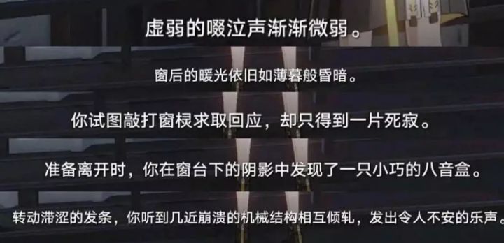 当你想要离开时能在窗台找到一个八音盒,很符合魂系一贯而来的恶毒描写(误