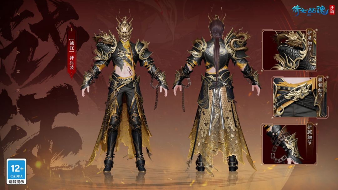 神兵装采用黑色和金色为主色调,黑色铠甲与凛冽的暗金色衣服相得益彰,散发出十足的狂霸之气,肩上的龙头护甲与腰间的腰锁呈怒吼之姿,威慑力倍增,为战狂增添了无穷的勇武之气。
